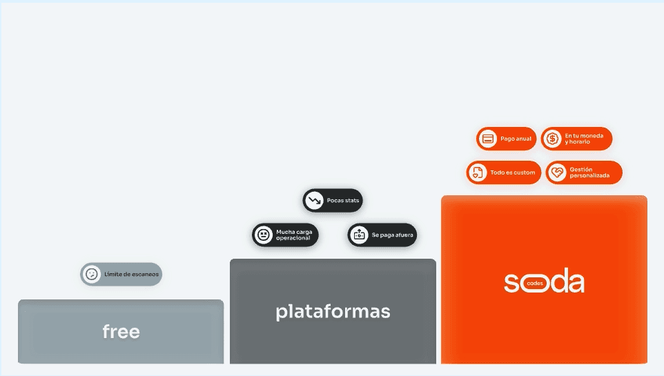 Si bien vivimos en una época en donde cualquier puede crear un QR y en el mercado existe servicios que los pueden crean por ti, el enfoque de soda codes es diferente. No es un autoservicio dónde después de darte las herramientas tienes que aprender a gestionarlas. Para reducir la carga operativa de manejar un QR que genera valor, nos encargamos de todo. Somos un partner estratégico que acelera la adopción de nuevas tecnologías. Al contratar un código, accedes a nuestra experiencia de más de veinte años en el mercado digital latinoamericano. Te ayudamos a descubrir sus usos potenciales, diseñar estrategias que impulsen su uso y optimizar su performance con analítica. Te ayudamos a crear experiencias Scan Ready.
